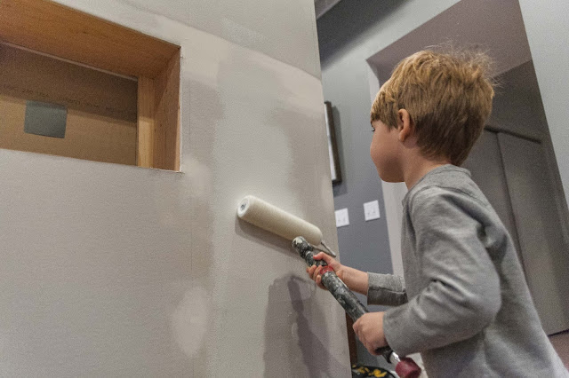 Then it was time to mud. I went down to the garage, pulled out my blue bin of drywall tools, and grabbed what I needed. On the way back upstairs, I mentioned to K how I like doing projects where we already have all the tools. Also, that we've done before.